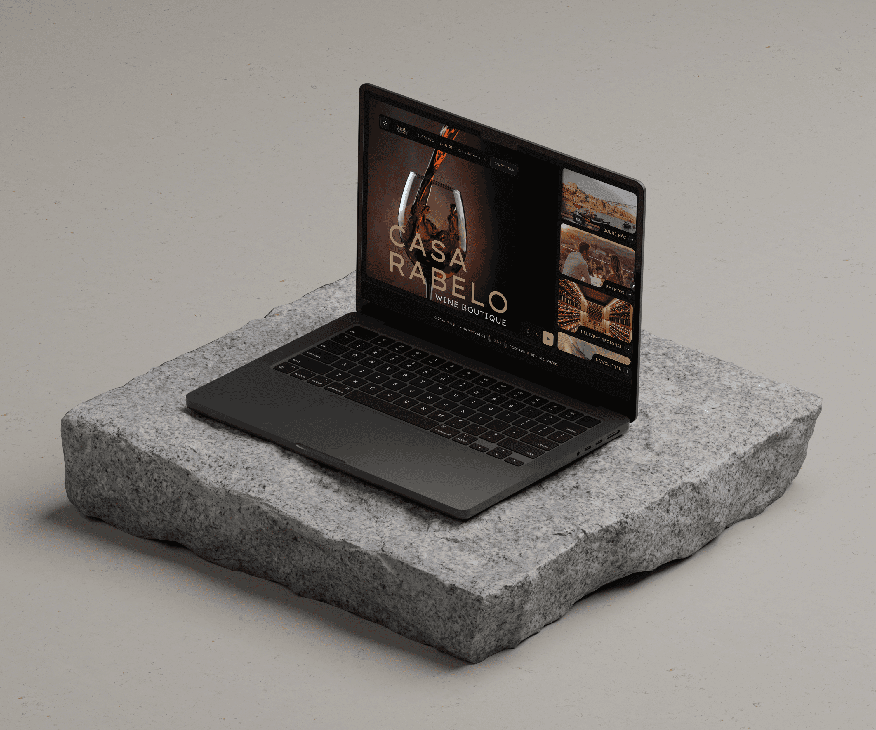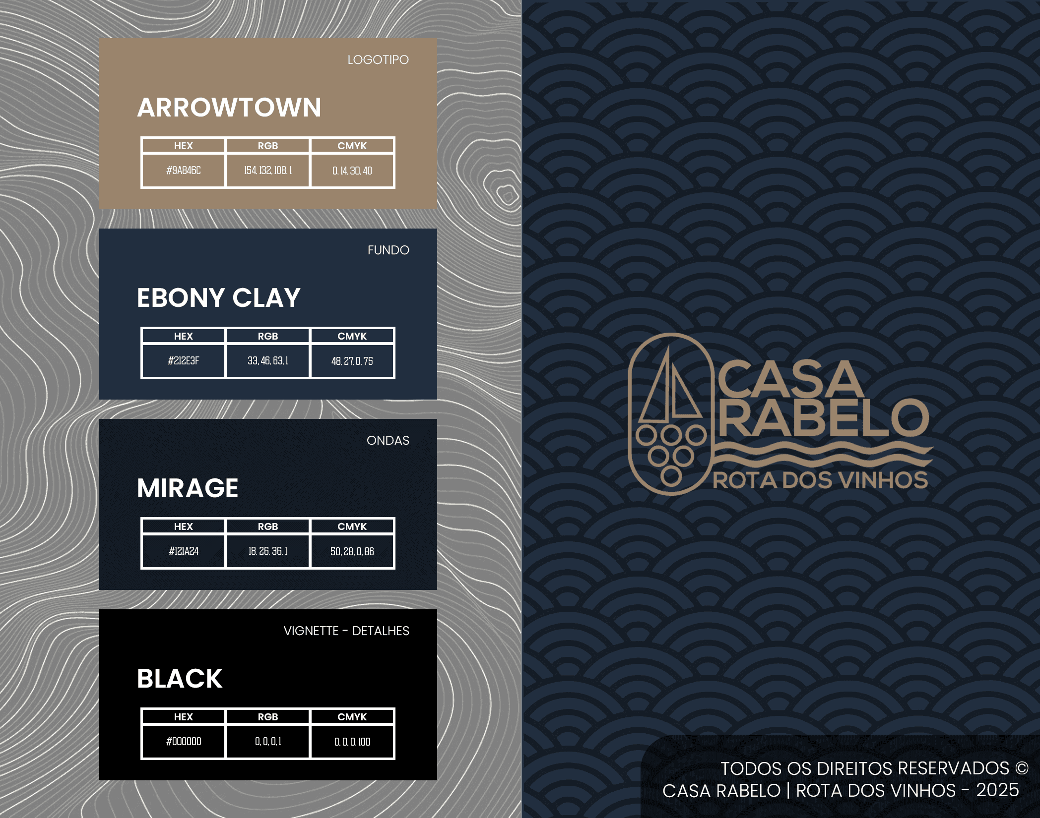 Casa Rabelo is a Brazilian wine boutique with a Portuguese soul. Inspired by the heritage of the Douro River and the iconic Rabelo boats that once carried barrels of wine through its currents. The brand celebrates the timeless connection between tradition, craftsmanship, and discovery, reinterpreted through a modern, sophisticated lens. I was responsible for developing the complete brand identity, including logo design, color system, visual language, and digital direction for the website and communication materials. The goal was to create a visual experience that feels both authentic and contemporary, evoking the warmth and elegance of Portuguese wine culture. Concept & Creative Direction: The concept draws from the fluid motion of the river and the refined textures of winemaking, where history and modernity flow together. Inspired by the architectural beauty of Porto and the sensory richness of wine, the visual identity conveys sophistication, calmness, and trust. The brand narrative centers around “a new route through the world of wine”, positioning Casa Rabelo as both a destination and a journey. A place where tradition meets contemporary taste. Visual System: Logo Design: A minimalist emblem inspired by the silhouette of a Rabelo boat, paired with clean geometric typography to convey precision and modern luxury. Color Palette: Deep, elegant tones of Ebony Clay, Arrowtown, and Mirage, evoking the hues of aged wood, river shadows, and the golden light of dusk over the Douro. Typography: A combination of refined sans-serifs with generous spacing, reflecting clarity, confidence, and timeless sophistication. Textures & Patterns: Topographic and wave-inspired motifs echo the movement of the river and the layered depth of the wine experience. The result is a cohesive and atmospheric identity that bridges heritage and modern lifestyle, expressing Casa Rabelo’s mission to offer not just exceptional wines, but unique moments of discovery and connection.